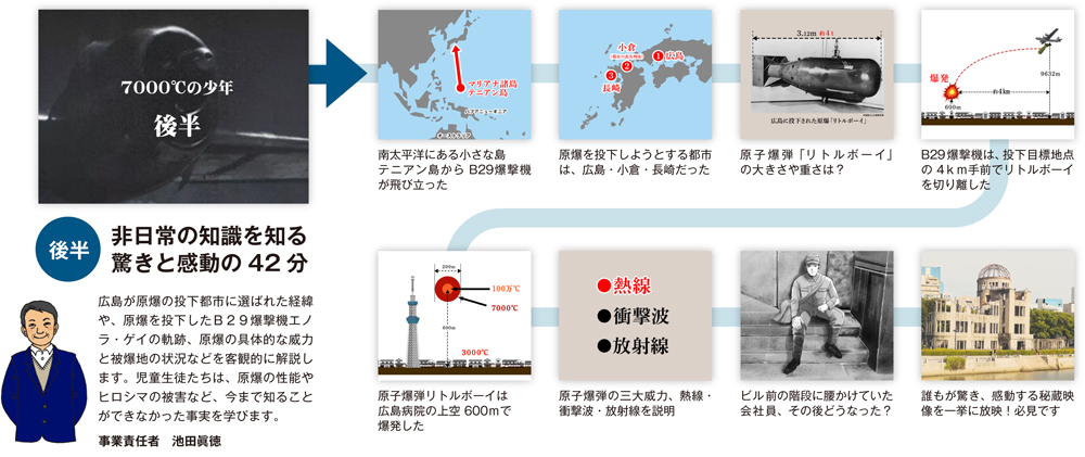 広島が原爆の投下都市に選ばれた経緯や、原爆を投下したB29爆撃機エノラ・ゲイの軌跡、原爆の具体的な威力と被爆地の状況などを客観的に解説します。児童生徒たちは、原爆の性能やヒロシマの被害など、今まで知ることができなかった事実を学びます。